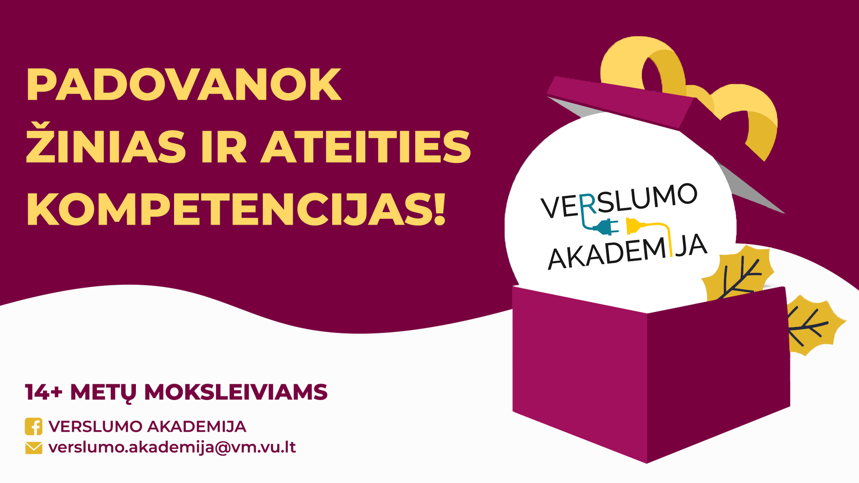 Kiekvienais metais VU Verslo mokyklos bendruomenės nariai ir draugai prisideda prie socialiai jautrių šeimmų vaikų verslumo ugdymo ir dovanoja jiems bilietus dalyvauti „Verslumo akademijoje“.